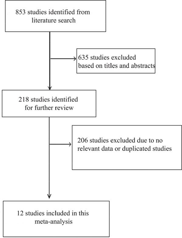 There were 853 studies identified from literature search, and 635 studies were excluded after reviewing titles and abstracts. The remaining 218 studies were evaluated based on full-text review, and 206 studies were excluded based on eligible criteria. Finally, twelve studies were included (Figure 1) [17–28].