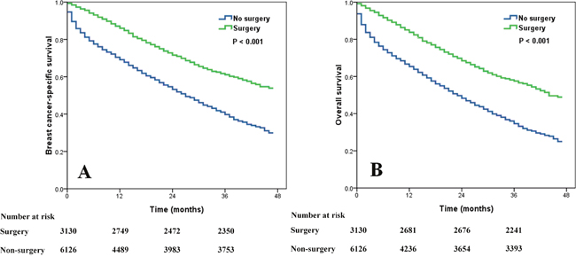 In total, 9,256 patients diagnosed with stage IV BC from 2010 to 2013 were identified including 3,130 (33.8%) patients received local surgery. The patient characteristics are showed in Table 1. Patients who chose local surgery tended to be younger, larger tumor sizes, poorly/undifferentiated disease, advanced nodal stage, and married. Patients with HR+/HER2- tumors were less likely to received local surgery, while patients with HR-/HER2- tumors were more likely to undergo local surgery. There was no difference for performing surgery among the race groups.