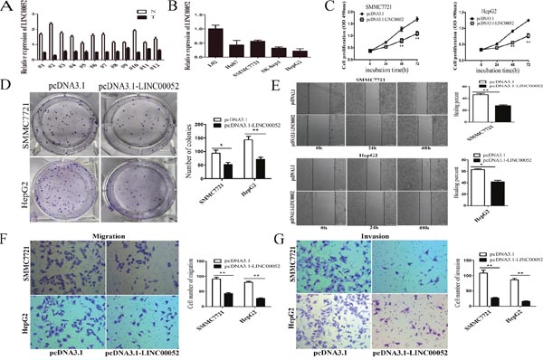 Figure 1: LINC00052 was downregulated in HCC and overexpression of LINC00052 inhibited HCC cell proliferation, migration and invasion in vitro. (A) LINC00052 expression in 12 pairs of HCC tissues (T) and non-tumor tissues (N). Transcript levels were normalized to GAPDH expression. (B) LINC00052 expression in L02 cells and four cell lines. Transcript levels were normalized to GAPDH expression. (C) Growth curves of SMMC7721 and HepG2 cells after transfection with pcDNA3.1-LINC00052 or pcDNA3.1. **P<0.01. (D) Colony formation assays determining the effect of LINC00052 upregulation on the growth of SMMC7721 and HepG2 cells. Representative graphs are shown. The data graphs depict the count number from three independent experiments. *P<0.05, **P<0.01. (E) Wound healing assay for determining the effect of LINC00052 upregulation on the healing of SMMC7721 and HepG2 cells. *P<0.05, **P<0.01. (F, G) Transwell and invasion assay of LINC00052 overexpressed cells. Data are shown as mean ± s.d. (n = 3) and are representative of three independent experiments. Scale bars = 100 μm. **P<0.01 (Student’s t-test).