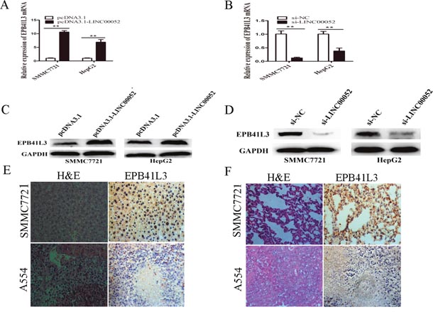 Figure 2: LINC00052 upregulated the expression of EPB41L3. (A) RT-qPCR analysis of EPB41L3 mRNA expression when SMMC7721 and HepG2 cells were transfected with pcDNA3.1-LINC00052 or pcDNA3.1 vector. Transcript levels were normalized to GAPDH expression. **P<0.01. (B) RT-qPCR analysis of EPB41L3 mRNA expression when SMMC7721 and HepG2 cells were transfected with si-LINC00052 or si-NC. Transcript levels were normalized to GAPDH expression. **P<0.01. (C) Western blot analysis of EPB41L3 protein expression when SMMC7721 and HepG2 cells were transfected with pcDNA3.1-LINC00052 or pcDNA3.1 vector, using GAPDH as an endogenous control. (D) Western blot analysis of EPB41L3 protein expression when SMMC7721 and HepG2 cells were transfected with si-LINC00052 or si-NC, using GAPDH as an endogenous control. (E) Hematoxylin and eosin (H&E) staining and immunohistochemical staining of EPB41L3 in the mouse liver of LINC00052 knockdown group compared with the control group in vivo. Representative micrographs were shown, original magnification (×400). (F) Hematoxylin and eosin (H&E) staining and immunohistochemical staining of EPB41L3 in the mouse lung of LINC00052 knockdown group compared with the control group in vivo. Representative micrographs were shown, original magnification (×400).