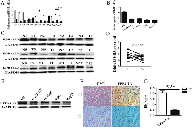 Figure 3: EPB41L3 was significantly downregulated in HCC tissues and HCC cell lines. (A) RT-qPCR analysis of EPB41L3 expression in 12 pairs of HCC tissues (T) and non-tumor tissues (N). Transcript levels were normalized to GAPDH expression. (B) RT-qPCR analysis of EPB41L3 expression in L02 cells and four cell lines. Transcript levels were normalized to GAPDH expression. (C) Western blot analysis of EPB41L3 protein expression in 12 pairs of HCC tissues (T) and non-tumor tissues (N), using GAPDH as an endogenous control. (D) Quantitation of EPB41L3 protein expression levels by their integrated light density values. n = 12, *P<0.05. (E) Western blot analysis of LINC00052 expressions in L02 cells and four cell lines, using GAPDH as an endogenous control. (F) Hematoxylin and eosin (H&E) staining and immunohistochemical staining of EPB41L3 in HCC tissues (T) and non-tumor tissues (N). (G) Total Immunohistochemical (IHC) score of EPB41L3 in HCC tissues and non-tumour tissues (n = 12). **P<0.01.