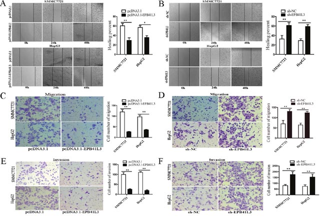Figure 4: EPB41L3 repressed HCC cell migration and invasion in vitro. (A, B) Wound healing assay were performed to determine the healing ability of EPB41L3 in SMMC7721 and HepG2 cells. *P<0.05, **P<0.01. (C-F) The effect of EPB41L3 on the migration and invasion of SMMC7721 and HepG2 cells was assessed using transwell assays. **P<0.01.