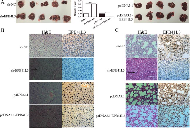 Figure 5: EPB41L3 repressed HCC metastasis in vivo. (A) Livers of metastases 6 weeks after orthotopic implantation stably overexpressed or interference EPB41L3 SMMC7721 cells (n=5). *P<0.05, **P<0.01. (B) H&E staining and immunohistochemical staining of EPB41L3. Representative photograph of livers. Black arrow: metastatic foci. (C) H&E staining and immunohistochemical staining of EPB41L3. Representative photographs of lung. Black arrow: metastatic foci.