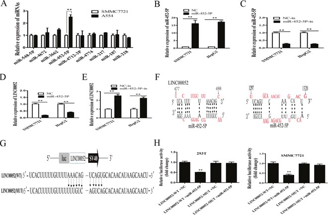 Figure 6: Reciprocal repression between LINC00052 and miR-452-5P. (A) Several miRNAs expressions in HCC cells that stably knocked down LINC00052(A554) and SMMC7721, using U6 as an internal control. **P<0.01. (B) RT-qPCR analysis of miR-452-5P expression in SMMC7721and HepG2 cells transfected with miR-452-5P mimic (miR-452-5P) or NC, using U6 as an internal control. **P<0.01. (C) RT-qPCR analysis of miR-452-5P expression in SMMC7721and HepG2 cells transfected with miR-452-5P inhibitor (miR-452-5P-in) or inhibitor NC (NC-in), using U6 as an internal control. **P<0.01. (D, E) miR-452-5P regulated the expression of LINC00052 in HCC cells. Relative expression levels of LINC00052 were detected by RT-qPCR, using U6 as an internal control. **P<0.01. (F) Predicted binding sites for miR-452-5P in LINC00052 sequences. Numbers show the nucleotides relative to the transcriptional start site of LINC00052. (G) Schematic of wild-type and mutant PGL3-LINC00052 constructs. (H) Luciferase assays of 293T and SMMC7721 cells transfected with PGL3-LINC00052-WT or PGL3-LINC00052-MUT reporter and NC or miR-452-5P mimic. **P<0.01.