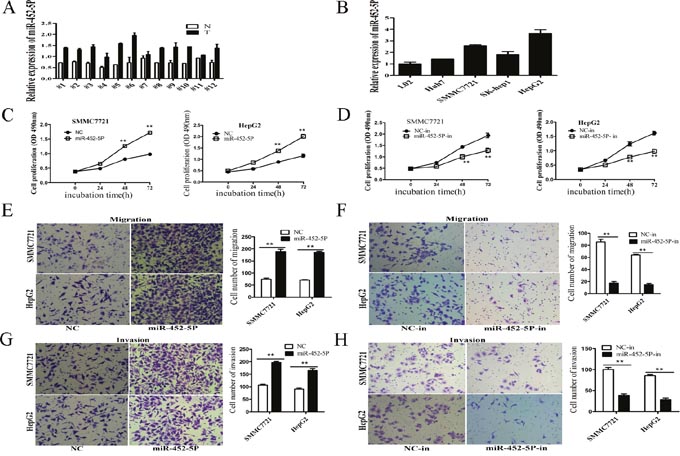 Figure 7: MiR-452-5p was upregulated in HCC tissues and HCC cell lines, and functioned as an oncogene. (A) RT-qPCR analysis of miR-452-5P expression in 12 pairs of HCC tissues (T) and non-tumor tissues (N), using U6 as an internal control. (B) RT-qPCR analysis of LINC00052 expression in L02 cells and four cell lines, using U6 as an internal control. (C) Growth curves of SMMC7721 and HepG2 cells after transfection with miR-452-5P or NC were determined by MTS assays. **P<0.01. (D) Growth curves of SMMC7721 and HepG2 cells after transfection with miR-452-5P inhibitor (miR-452-5P-in) or inhibitor NC (NC-in), were determined by MTS assays. **P<0.01. (E-H) The effects of miR-452-5P on the migration and invasion of SMMC7721 and HepG2 cells were performed using transwell assays. **P<0.01.