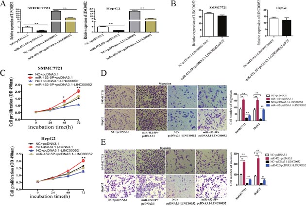 Figure 8: MiR-452-5P recovered LINC00052 function. (A) SMMC77221 and HepG2 cells were co-transfected with miR-452-5P mimic and LINC00052 expression plasmid, and the effect of miR-452-5P on ectopically expressed LINC00052 was analyzed by RT-qPCR. **P<0.01. (B) SMMC77221 and HepG2 cells were co-transfected with miR-452-5P mimic and pcDNA3.1-LINC00052-MUT plasmid (with miR-452-5P mutant binding site), and the effect of miR-452-5P on ectopically mutant LINC00052 expression was analyzed by RT-qPCR. **P<0.01. (C) SMMC77221 and HepG2 cells were co-transfected with negative control or miR-452-5P mimic and control plasmid (pcDNA3.1) or LINC00052 expression plasmid (pcDNA3.1- LINC00052) and cell proliferations were determined using MTS assays. *P<0.05, **P<0.01. (D, E) Transwell migration and invasion assays of HCC cells after cotransfected with negative control or miR-452-5P mimic and control plasmid (pcDNA3.1) or LINC00052 expression plasmid (pcDNA3.1- LINC00052).**P<0.01.
