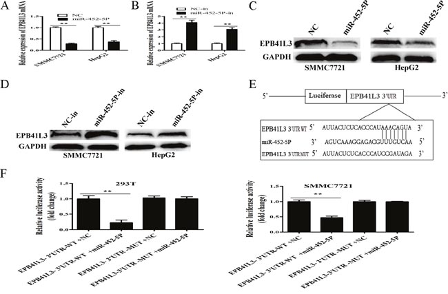 Figure 9: EPB41L3 was a direct target of MiR-452-5P. (A) RT-qPCR analysis of EPB41L3 mRNA expression when SMMC7721 and HepG2 cells were transfected with miR-452-5P mimic or NC. Transcript levels were normalized to GAPDH expression. **P<0.01. (B) RT-qPCR analysis of EPB41L3 mRNA expression when SMMC7721 and HepG2 cells were transfected with miR-452-5P inhibitor (miR-452-5P-in) or inhibitor NC (NC-in). Transcript levels were normalized to GAPDH expression. **P<0.01. (C, D) miR-452-5P regulated the expression of EPB41L3 in HCC cells. Relative protein expression levels of EPB41L3 were detected by Western blot analysis, using GAPDH as an endogenous control. (E) Schematic of wild-type and mutant PGL3-EPB41L3-3’UTR constructs. (F) Luciferase assays of 293T and SMMC7721 cells transfected with PGL3-EPB41L3-3’UTR-WT or PGL3- EPB41L3-3’UTR-MUT reporter and NC or miR-452-5P mimic. **P<0.01.