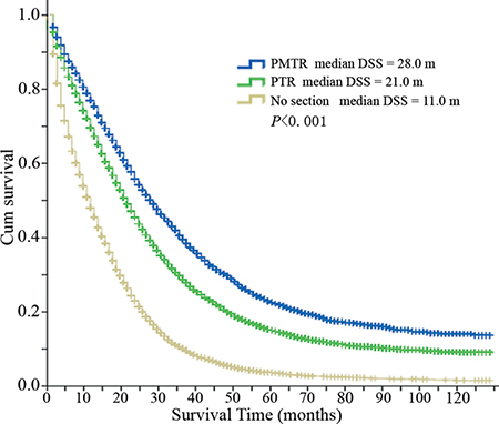 Figure 1: Disease specific survival curves of different groups. Median DSS of group ‘PMTR’ = 28.0 months, median DSS of group ‘PTR’ = 21.0 months, and median DSS of group ‘No resection’ = 11.0 months, P < 0.001. Abbreviations: DSS, disease specific survival; PMTR, resection of both primary and distant metastatic tumors; PTR, primary tumor resection.