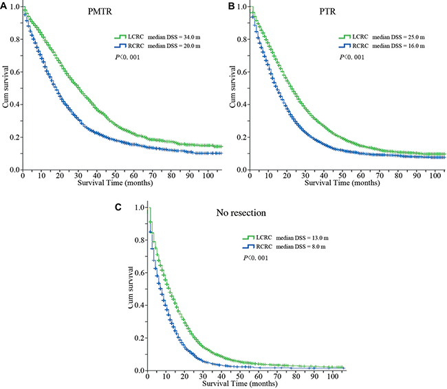 Figure 2: Disease specific survival curves of patients with different primary tumor locations. (A) Disease specific survival curves of patients with different primary tumor locations in group ‘PMTR’ (median DSS, LCRC = 34.0 months, RCRC = 20.0 months, P < 0.001). (B) Disease specific survival curves of patients with different primary tumor locations in group ‘PTR’ (median DSS, LCRC = 25.0 months, RCRC = 16.0 months, P < 0.001). (C) Disease specific survival curves of patients with different primary tumor locations in group ‘No resection’ (median DSS, LCRC = 13.0 months, RCRC = 8.0 months, P < 0.001). Abbreviations: DSS, disease specific survival; PMTR, resection of both primary and distant metastatic tumors; PTR, primary tumor resection; LCRC, left-sided colorectal cancer; RCRC, right-sided colorectal cancer.