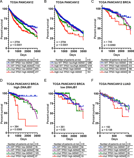 Figure 1: Cancer patients, with mutated TP53 and simultaneous elevation of MDM2, exhibit decreased survival rate post treatment. Kaplan-Meier survival curves depict percent survival of patients within the whole analyzed database or from particular cancer subtypes. (A) Cancer patients from the entire TCGA PANCAN12 dataset were analyzed with respect to their TP53 mutation status and MDM2 mRNA expression levels (p = 2.4e-06). (B) TP53 mutation(s) linked with their expression levels and in addition with MDM2 expression levels were considered for TCGA PANCAN12 patients. Expression of TP53 gene, similar to MDM2 was separated into low/high groups with the median expression used as a cutoff (p = 9e-05). (C) Breast Invasive Carcinoma (BRCA) patients with TP53 mutation(s) and MDM2 mRNA expression levels were analyzed (p = 0.026). Additionally, BRCA patients were divided into two cohorts depending on the level of DNAJB1 gene expression, DNAJB1 High (D) and DNAJB1 Low (E). Subsequent analysis of TP53 mutation status and MDM2 mRNA expression levels followed independently for these two high/low groups with the median expression, derived from patients within the BRCA cohort, used as a cutoff (D) (p = 0.0066), (E) (p = 0.53). (F) Lung Adenocarcinoma (LUAD) patients with TP53 mutation(s) and MDM2 mRNA expression levels were analyzed (p = 0.138), median expression of MDM2 derived from patients within the LUAD cohort. Statistical significance (P value) was verified by means of the log-rank test for trend.