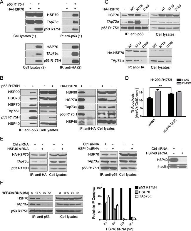 Figure 3: Molecular chaperones facilitate p53 R175H-TAp73α complex formation. (A) Double immunoprecipitation experiments (Two step Co-IP). H1299 cells were transfected with plasmids encoding p53 R175H, TAp73α and HA-HSP70. After 24 h cellular proteins were cross-linked and the first co-immunoprecipitation (1) with anti-p53 antibody was carried out. Protein complexes were eluted from beads (Cell lysates 2) and second co-immunoprecipitation (2) with anti-HA antibody was performed. Laemmli buffer was supplemented with DTT to reverse cross-linking reaction. Lysates from cells transfected with plasmids encoding TAp73α and HA-HSP70 but not p53 R175H were used as a control of the specificity of anti-p53 antibody (first lane, right panel). (B) H1299 cells were transfected with plasmids encoding p53 R175H and TAp73α (left panel) or p53 R175H, TAp73α and HA-HSP70 (right panel). Immunoprecipitations were carried out with anti-p53 (left panel) or anti-HA antibody (right panel) to immunoprecipitate p53 or HA-HSP70, respectively. As a control of the specificity of antibodies applied for immunoprecipitations, cell lysates with no p53 R175H or no HA-HSP70 were used (–). (C) H1299 cells were transfected with plasmids encoding p53 R175H, TAp73α and HA-HSP70 WT/K71S/D10S respectively. 24 h post-transfection cells were lysed and p53 protein was immunoprecipitated with anti-p53 antibody – top panel, or with anti-HA antibody – bottom panel. The immunoprecipitated protein complexes were analyzed by Western blot. (D) H1299-R175H cells were transfected with a plasmid encoding HA-HSP70 D10S or with a control plasmid (pcDNA). After 6 h the medium was supplemented with 0.5 μM Ponasterone A (Pon A) to induce p53 R175H. Cells with no induction were treated with DMSO. After 24 h treatment with 60 μM Cisplatin, the apoptotic response of cells stained with Annexin V/Gel Green dye was measured by FACS. Bars represent the decrease (%) of cells in early apoptosis (Annexin V positive, Gel Green dye negative), normalized to non-treated control. Statistical significance (P value) was counted for three independent experiments with Anova statistical test. ** indicates statistical significance p < 0.01. (E) HSP40 molecular chaperone drives the formation of the complex p53 R175H-TAp73α with HSP70. H1299 cells were transfected with plasmids encoding p53 R175H, TAp73α and HA-HSP70 (left Western blot panel) or p53 R175H and TAp73α (middle panel). 18 h post the initial transfection, the cells were transfected once more with siRNA (50 nM) silencing the expression HSP40 (efficacy of silencing showed on the far right panel). Immunoprecipitations were carried out with anti-HA antibody (left Western blot panel) or anti-p53 antibody (middle panel) to immunoprecipitate HA-HSP70 or p53, respectively. (F) Dissociation of the p53 R175H-TAp73α complex is caused by HSP40 inhibition in a dose dependent manner. The procedure was carried out analogously to (E) with the secondary transfection comprising a range of HSP40 siRNA (0–50 nM) in two-fold dilutions, as depicted. Immunoprecipitations were carried out with anti-p53 antibody. Differences in the levels of bound HSP70 and TAp73α bound to p53 R175H were determined by densitometric analysis (right panel). The values obtained from three independent biological experiments were normalized to the level of immunoprecipitated p53 R175H for each concentration of HSP40 siRNA used.