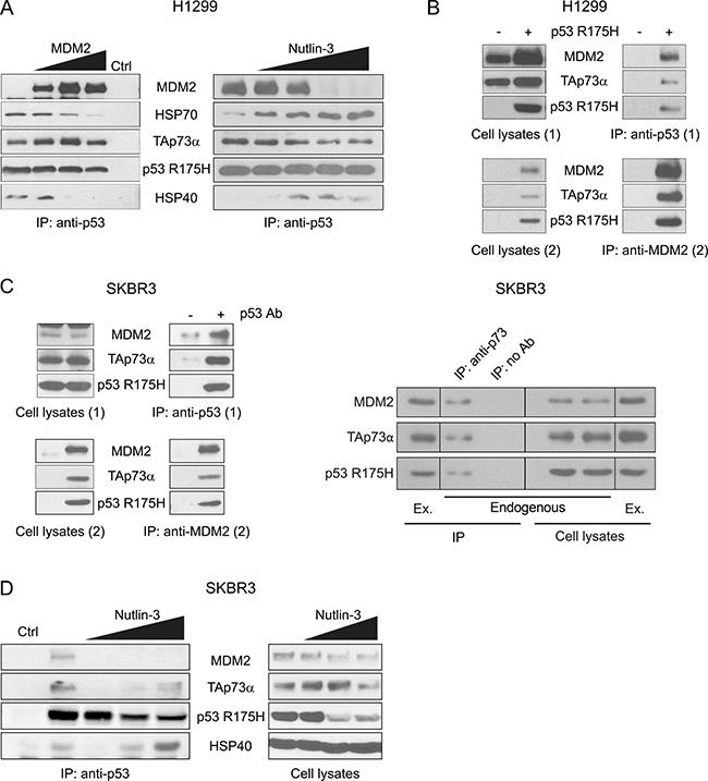 In the case of H1299 lung cancer cells, ectopic expression of MDM2 released HSPA1A/HSP70 and DNAJB1/HSP40 from the p53 R175H-TAp73α complex in a dose dependent manner, thus leading to the formation of p53 R175H-TAp73α-MDM2 complex (Figure 4A). Moreover, in the case of MDM2 overproduction, titration of Nutlin-3, a known MDM2 inhibitor [97, 98], reversed the reaction: MDM2 was released from p53 R175H-TAp73α complex and endogenous HSPA1A/HSP70 and DNAJB1/HSP40 rebound to the p53 R175H-TAp73α complex (Figure 4A). To support the notion that MDM2 simultaneously interacts with mut p53 and TAp73α, the two-step Co-IP methodology was employed. It revealed that under conditions where MDM2 was elevated, a stable three-body complex comprising of p53 R175H-TAp73α-MDM2 had formed (Figure 4B). Moreover, a similar complex was observed in the breast cancer SKBR3 cell line, which expresses endogenous p53 R175H (Figure 4C left panel). In control experiments we showed that endogenous p53 R175H simultaneously interacted with endogenous TAp73α and MDM2 forming a three-body complex (Figure 4C right panel). The pre-existing p53 R175H-TAp73α-MDM2 complex, composed from endogenous proteins, was also sensitive to increasing concentration of Nutlin-3 (Figure 4D). At low concentration of Nutlin-3 almost no detectable level of MDM2 and TAp73α was observed in the complex. However, further increase in Nutlin-3 concentration resulted in the appearance of HSP40 and TAp73α in the complex with p53 R175H. These results suggest that the presence of Nutlin-3 shifts the equilibrium from a three-body p53 R175H-TAp73α-MDM2 complex to a binary R175H-TAp73α structure and its formation is stimulated by the presence of molecular chaperones (Figure 4D left panel). Noticeably, in the appropriate input lanes (cell lysates, Figure 4D right panel) increasing concentration of Nutlin-3 decreased the total amount of p53 R175H and TAp73α. Nutlin-3 was shown before to decrease the stability of p53 R175H by destroying p53 R175H-multichaperone complex [74, 75]. Interestingly, similarly to the stability decrease of mut p53 in the presence of Nutlin-3, one can observe that the abundance of TAp73α was also affected. This makes the interpretation of the IP results more difficult, but could also open a new avenue of investigation of the role of molecular chaperones in stability of TAp73α and/or subsequent conversion of TAp73α to the different p73 isoforms.