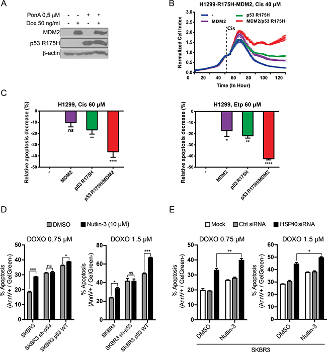 (Baseline–Apoptotic response of uninduced H1299-R175H-MDM2 cell line). Statistical significance (P value) was counted for three independent experiments with Anova statistical test. *, **, ***, **** indicate statistical significance p < 0.05, p < 0.01, p < 0.001, p < 0.0001, respectively. (D) Apoptotic response measurements of the SKBR3 derived cell lines treated with Doxorubicin (DOXO). The cells were exposed to 0.75 μM and 1.5 μM concentrations of DOXO. Nutlin-3 at 10 μM concentration was added to the cells at the same time as DOXO, DMSO was used as a negative control. An additional control of Nutlin-3 only treated cells was also carried out. 24–30 h post treatment the measurement of apoptotic cells was performed with flow cytometry. Bars represent the percentage of cells in early apoptosis (Annexin V positive, GelGreen negative), normalized to non-treated control. Statistical significance (P value) was counted for three independent experiments with Anova statistical test. (E) Apoptotic response measurements of the SKBR3 cells with HSP40 siRNA knockdown treated with Nutlin-3 and doxorubicin (DOXO). The cells were initially transfected at low density with HSP40 siRNA/Ctrl siRNA (50 nM) twice in 36-hour intervals (The efficacy of silencing was determined by WB analysis–data no shown). Afterwards the cells were exposed to DOXO and Nutlin-3 and the experiment was carried out analogously to (D). Statistical significance (P value) was counted for three independent experiments with Anova statistical test.
