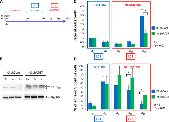 Figure 1: Low oxygen concentration decrease proliferation of K562 cells. (A) K562 cells expressing a shRNA against luciferase (KS shCont) or a shRNA against ATG7 (K shATG7) were cultured at low O2 concentration (hypoxia 0.1% O2) for 7 days (LC1). Upon 7 days, cells were replaced at atmospheric O2 concentration and grown until day 14 (LC2). (B) At day 0, 4 and 7, samples were proceed to analyze conversion of LC3B-I in LC3B-II by western-blot. (C) and (D) At indicated time, aliquot were analysed for cell count by trypan blue exclusion assay and apoptosis by flow cytometry using annexin V-APC labelling. Results are from at least 5 experiments. Significance between autophagy competent and deficient cells was quantitated using Wilcoxon test and show by an asterisk when p < 0.01.