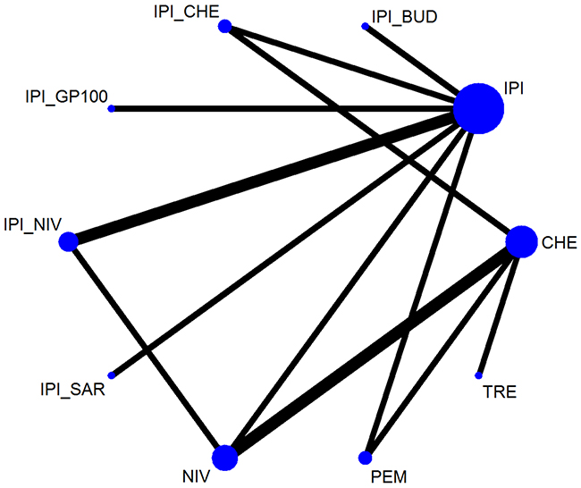 Figure 2: Network of the comparisons for the Bayesian network meta-analysis. CHE = chemotherapy. IPI = ipilimumab. TRE = tremelimumab. NIV = nivolumab. PEM = pembrolizumab. IPI_CHE = ipilimumab plus chemotherapy. IPI_NIV = ipilimumab followed by nivolumab. IPI_GP100 = ipilimumab plus glycoprotein 100. IPI_BUD = ipilimumab plus budesonide. IPI_SAR = ipilimumab plus sargramostim.