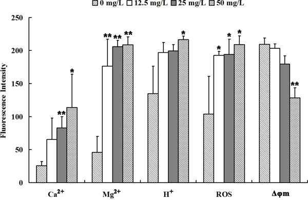 The results of CLSM are shown in Figure 4. Intracellular Ca2+ levels increased after treatment with 25 or 50 mg/L Se2Mo10V3 (both P<0.05). Intracellular Mg2+ levels also increased after treatment with 12.5, 25, or 50 mg/L Se2Mo10V3 (all P<0.01). Intracellular H+ levels also increased, indicating that intracellular pH decreased, after treatment with 50 mg/L Se2Mo10V3 (P<0.05). In addition, intracellular ROS levels increased after treatment with 12.5, 25, or 50 mg/L Se2Mo10V3 (all P<0.05). Finally, Δφm was markedly reduced after treatment with 50 mg/L Se2Mo10V3 (P<0.01).
