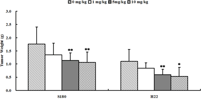 Figure 5: Se2Mo10V3 inhibited the growth of S180 and H22 xenografts in vivo. Data are expressed as means ± S.D. (n=10). *P<0.05, **P<0.01 versus control tumor-bearing mice.