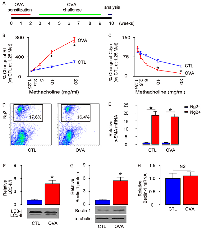 Figure 1: Enhanced ASM cell autophagy is detected in mouse lung after OVA treatment. (A) Schematic of OVA model. Mice were first sensitized to alum-adsorbed OVA for 2 weeks, and then exposed to repeated airway provocation for another 7 weeks to establish airway hyper-sensitivity. (B) Dose-dependent responses in lung resistance (Rl) to methacholine. (C) Dose-dependent dynamic compliance (Cdyn) in response to methacholine. (D) Representative flow charts for purification of ASM cells from lung digests at the end of 7-weeks’ OVA challenge, based on Ng2 expression. (E) RT-qPCR for α-smooth muscle actin (α-SMA) in Ng2+ and Ng2- cells. (F) Western blotting for LC3 in Ng2+ and Ng2- cells. (G-H) Western blotting (G) and RT-qPCR (H) for Beclin-1 in Ng2+ and Ng2- cells. *p<0.05. NS: non-significant. N=10.