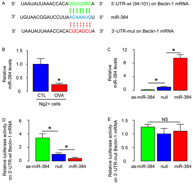 Figure 2: Enhanced autophagy in ASM cells from OVA-treated mice likely results from loss of suppression of protein translation of Beclin-1 by miR-384. (A) Bioinformatics to illustrate the binding site for miR-384 on wildtype (wt) 3’-UTR of Beclin-1 mRNA as well as the mutate (mut) 3’-UTR for luciferase reporter assay. (B) RT-qPCR for miR-384 in ASM cells after OVA. (C) RT-qPCR for miR-384 in ASM cells transfected with miR-384 mimics, antisense for miR-384 (as-miR-384) or null controls (null). (D-E) luciferase reporters containing the 3’-UTR of Beclin-1 mRNA (D) or a mutated 3’-UTR of Beclin-1 mRNA in the miR-384 binding site (E) were constructed. These reporter plasmids were co-transfected with miR-384 mimics, as-miR-384 or null controls to ASM cells and luciferase activity was determined. *p<0.05. NS: non-significant. N=10.