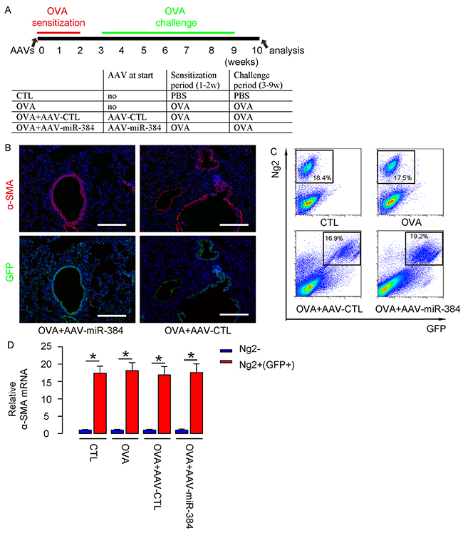 Figure 4: Successful in vivo re-expression of miR-384 in ASM cells. (A) Schematic of the experiment: AAVs were used to treat mice at the beginning of OVA sensitization. Four group of mice of 10 of each were included in this experiment. Group 1, the mice received saline only as control for OVA (CTL). Group 2, mice received OVA treatment only (OVA). Group 3, mice received OVA and intranasal injection of AAV-CTL (OVA+AAV-CTL). Group 4, mice received OVA and intranasal injection of AAV-miR-384 (OVA+AAV-miR-384). (B) Immunostaining for α-SMA and GFP in AAVs/OVA-treated mice. Nuclei were stained with DAPI. (C) (Transduced) ASM cells were thus isolated from 4 groups, shown by representative flow charts. (D) RT-qPCR for α-smooth muscle actin (α-SMA) in Ng2+(GFP+) and Ng2- cells. *p<0.05. NS: non-significant. N=10. Scale bars are 100 μm.