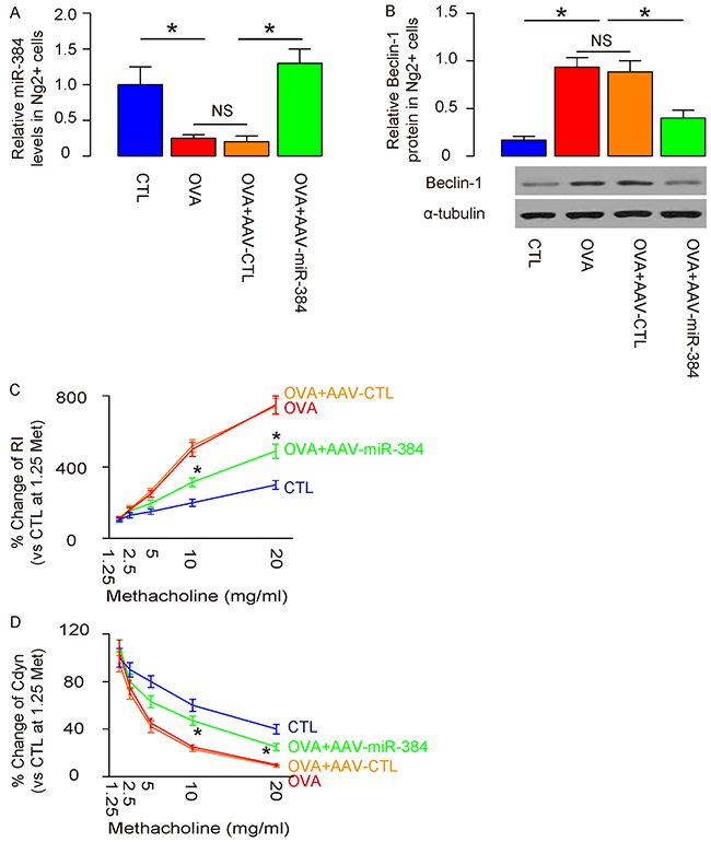 Figure 5: Overexpression of miR-384 in ASM cells significantly reduces ASM cell autophagy and attenuates OVA-induced airway hypersensitivity. (A) RT-qPCR for miR-384 in purified ASM cells from 4 groups. (B) Western blotting for Beclin-1 in purified ASM cells from 4 groups. (C) Dose-dependent responses in lung resistance (Rl) to methacholine. (D) Dose-dependent dynamic compliance (Cdyn) in response to methacholine. *p<0.05. In C and D, statistics were performed to compare group OVA+AAV-CTL and OVA+AAV-miR-384. NS: non-significant. N=10.