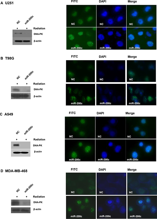 Figure 2: Overexpression of miR-200c led to prolonged γH2AX focus formation and p-DNA-PKcs downregulation. Overexpression of miR-200c caused a marked prolongation of γH2AX focus formation at 4 hours after irradiation with 6 Gy (right panels) and was associated with discernible downregulation of p-DNA-PKcs (left panels) in U251 (A), T98G (B), A549 (C), and MDA-MB-468 (D) cells. β-actin was probed as a control.
