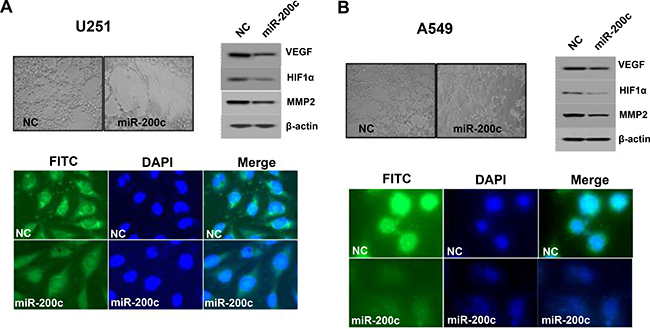 Overexpression of miR-200c led to discernible inhibition of vasculogenic mimicry and was associated with downregulation of VEGF, HIF-1α, and MMP2. The overexpression of VEGF in human cancer cell lines U251 and A549 was confirmed by immunocytochemistry using an anti-VEGF antibody. However, treating these cell lines with miR-200c resulted in significantly lower VEGF expression (Figure 4A and 4B).