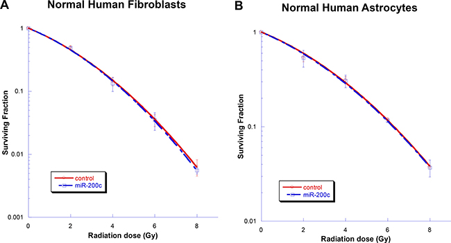 Figure 6: Testing toxicity of miR-200c in normal cells. Ectopic overexpression of miR-200c did not alter the radiosensitivity of normal human astrocytes (A) or normal human fibroblasts (B). Points on the survival curves represent mean surviving fractions calculated from the treated cells in triplicate. Each experiment was also repeated three times with similar results.