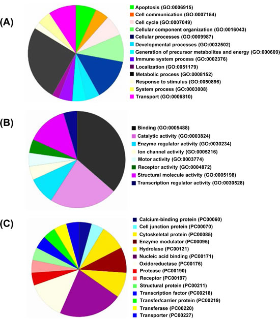 Figure 2: Gene Ontology analysis. All the significantly modulated proteins identified in nanoLC-MS/MS (as detailed with bold blue color in Supplementary Table 1) were classified according to their GO descriptions and PANTHER classification systems and analyzed on the basis of Biological Processes (A), Molecular Functions (B), and Protein Classes (C).