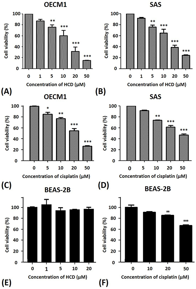 Figure 1: Alterations of the cell viability of OECM1 and SAS cells after HCD and cisplatin treatments. (A) OECM1, (B) SAS, and (E) BEAS-2Bcells were incubated with 0 to 50 μM of HCD for 24 h, and the cell viability was determined by a MTT assay. Cell viability of (C) OECM1, (D) SAS, and (F) BEAS-2Bafter cisplatin treatment for 24 h are also shown. The data are presented as the mean ± SE of three independent experiments. * P < 0.05, ** P < 0.01 and *** P < 0.001 when compared with the untreated control (0 μM).