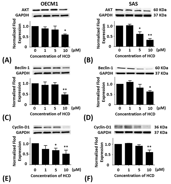 Cisplatin is a traditional anti-cancer agent for treating prostate cancer, bladder cancer, and gastric cancer [15]. Cisplatin has been shown to cause apoptotic cell death [16] and exerts an apoptotic action via mitochondria-mediated activation of caspases [17]. The signals are involved two apoptosome molecules, cytochrome c and Apaf-1, the activation of caspase-9 and caspase-3, downstream molecules leading to mitochondria-mediated apoptosis, and evidenced by cleavage of PARP through the activation of caspase-3. Cisplatin is the most efficient drug used for treating OSCC in clinics. It is applied as a positive control in this study to verify the efficacy of testing compounds. This study investigates whether HCD could result in the inhibition of human OSCC cells (OECM1 and SAS) growth by a MTT assay, flow cytometry assay, and Western blotting. Further study was determined HCD that might cause autophagy through the mTOR/PI3K/Akt/Beclin-1 signaling pathway.