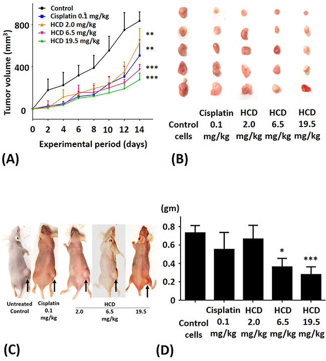 Six-week-old BALB/c nu/nu male mice (n= 30) were purchased from the National Laboratory Animal Center (Nan-Kang, Taiwan) and kept at controlled environmental conditions at room temperature (22 ± 2°C) with the humidity (55 ± 10%). The 12 h light (0600 am–1800 pm) and 12 h dark cycle was maintained throughout the study. The animals were fed a commercial diet and provided water ad libitum. The animal experimental protocols were followed as per the “Guide for the Care and Use of Laboratory Animals” of National Dong-Hwa University approved by the National Dong-Hwa University Animal Ethics Committee. SAS cells (8×105 cells in 0.2 mL of DMEM) were subcutaneously injected into the right dorsal flank of nu/nu mice (n = 6 per group). When tumor volume reached 0.6 cm3, they were randomly allotted into 3 groups: Control, Cisplatin (0.1 mg/kg B.wt), and HCD (2.0, 6.5, and 19.5 mg/kg B.wt). Mice were intraperitoneally treated with HCD and cisplatin once every two days for a total of seven treatments. The body weight of inoculated tumor cell nude mice was measured once every two days. Tumor growth was measured twice weekly until sacrifice. The tumor volume was calculated based on the formula: (Length × Width2)/2.