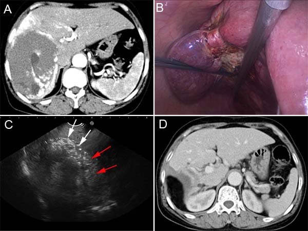 RF ablation for hepatic hemangiomas can be performed via percutaneous or laparoscopic approach. The diversity of approaches helps extending the scope of treatment indication. Hepatic hemangiomas deeply located in liver parenchyma are suited to be treated by percutaneous image-guided RF ablation. Subcapsular hepatic hemangioma is suitable to be treated via laparoscopic approach using ultrasound guidance [10-12].