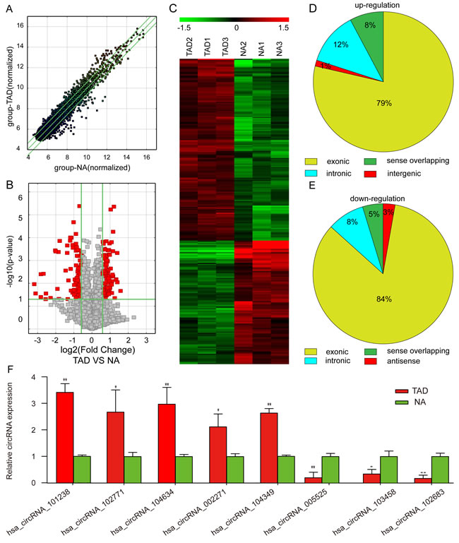 There are several limitations in this study. There are several limitations in this study. First, the data in this study is based on a small sample size. Future studies should endeavor to recruit larger number of TAD samples to confirm our results. Second, the sample collection time in our study was all at day. We will collect the sample at night and analysis how circadian rhythm affected the circRNA expression. Third, the study of circRNAs in TAD has just started, and the functional analysis is imperfect. Further functional studies should be done to improve this shortcoming in the future.