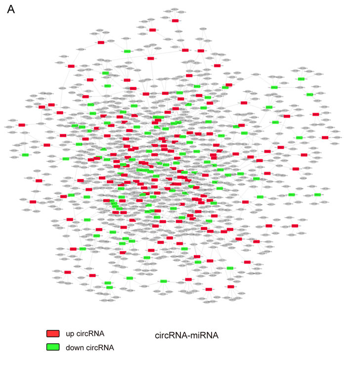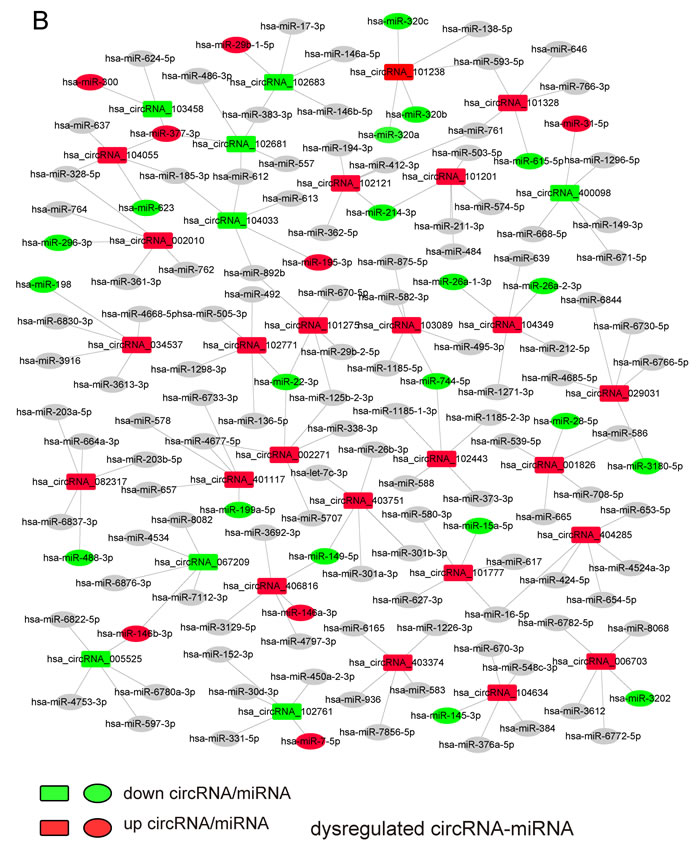 Figure 3: The circRNA-miRNA co-expression network and functional annotations for target genes of altered miRNAs. A. The panorama network comprising 156 upregulated circRNAs (red rectangle nodes), 106 downregulated circRNAs (green rectangle nodes), and their top 5 target miRNAs. B. A magnified network consists of 25 upregulated circRNAs(red rectangle nodes) and their 24 target downregulated miRNAs (green oval nodes), eight downregulated circRNAs (green rectangle nodes) and their seven target upregulated miRNAs (red oval nodes). C. Functional annotations for the target genes of altered miRNAs.