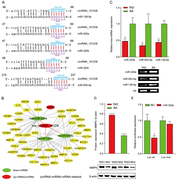 Figure 4: The biomathematically predicted hsa_circRNA_101238-targeted miRNA-mRNA network based on sequence-pairing prediction and validation for the expression of hsa-miR-320a and MMP9. A.hsa_circRNA_101238 and its top 5 predicted miRNA targets. B. 5 miRNAs and 46 genes were targeted in the present hsa_circRNA_101238-miRNA-mRNA network. In this figure, hsa-miR-320a exhibited the highest degree, followed by hsa-miR-138-5p, hsa-miR-593-5p, hsa-miR-320b, and hsa-miR-320c. C. qRT-PCR analysis shows the expression of hsa-miR-320a, hsa-miR-138-5p and hsa-miR-593-5p in the TAD tissues as compared to the normal controls. *P<0.05, n = 3. D. Western blot analysis shows the level of MMP9 protein in the TAD tissues as compared to NA. β-actin is an internal control. **P < 0.01, n = 3. E. Luciferase reporter analysis of either wild-type or mutant hsa-miR-320a activity. hsa_circRNA_101238 was co-transfected with the wild-type or mutant vector. The presented values are the mean ± SEM of 3 different preparations *P < 0.05.