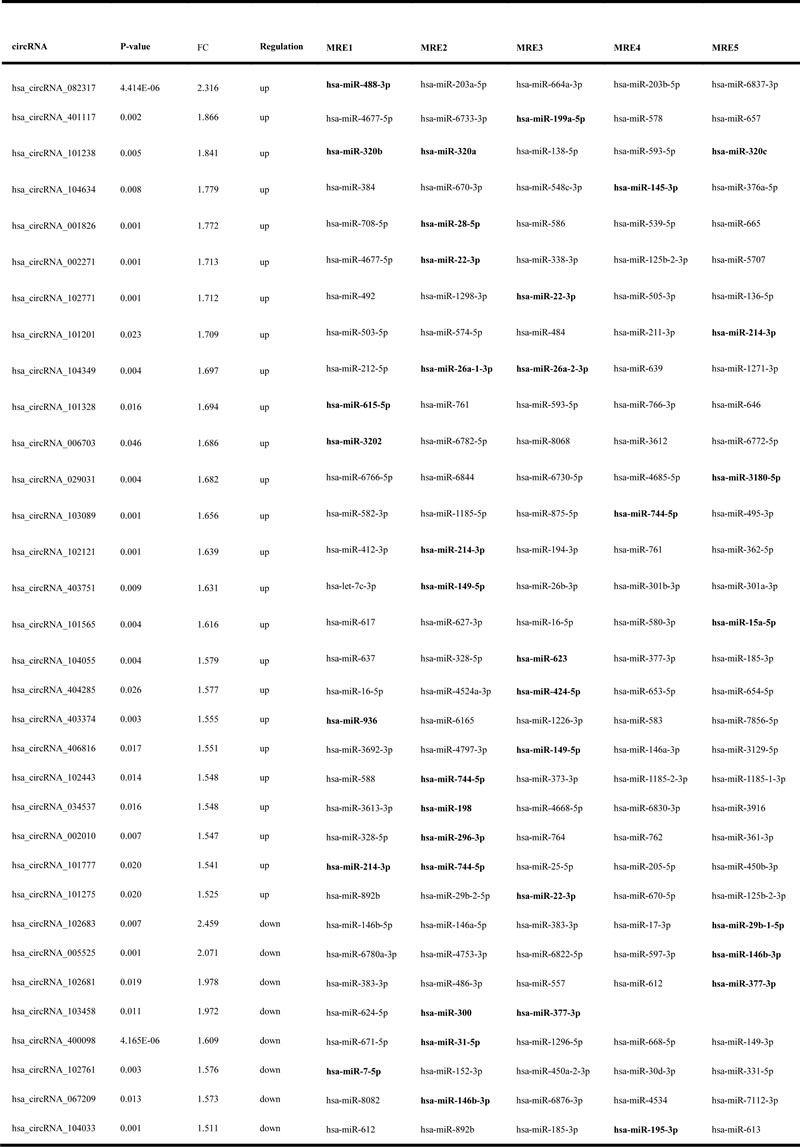 Table 1: circRNAs that have at least one predicted target miRNA modified in TAD