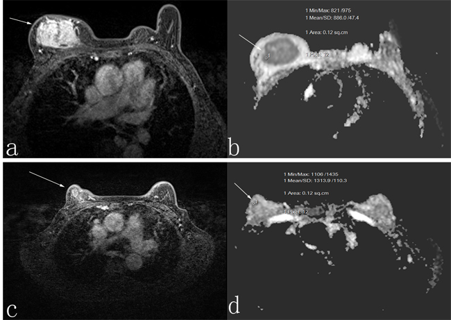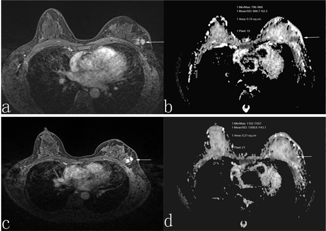 Figure 2: A 45-year-old woman who was non-responder with invasive ductal carcinoma. Before neoadjuvant chemotherapy, the lesion diameter was 3.0 cm in transverse contrast-enhanced T1-weighted image a. the apparent diffusion coefficient (ADC) value was 1.01 × 10-3 mm2/s b. After neoadjuvant chemotherapy, the lesion diameter was 2.8 cm in transverse contrast-enhanced T1-weighted image c., and the ADC value was 1.06 × 10-3 mm2/s d.