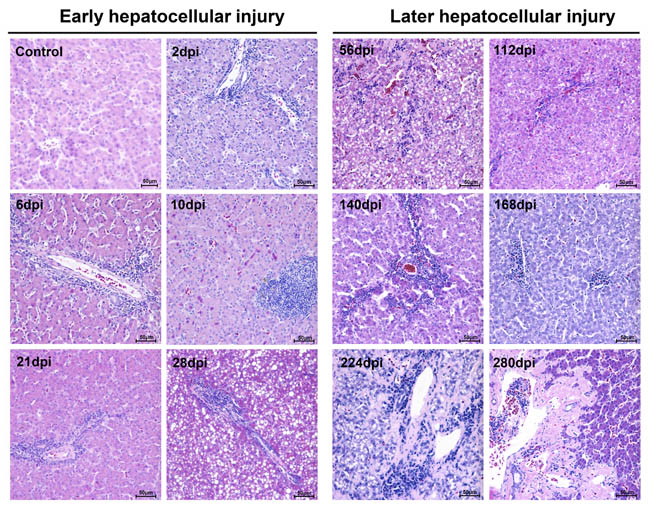 Figure 1: Microscopic lesions in mature ducks experimentally infected with DHAV-1 H strain. Representative liver HE staining from 1d to 280d post-infection with DHAV are displayed from two stages, early infection and later infection (n = 5). (Con) represents pre-inoculation liver photomicrograph. The brightness and contrast are slightly modified to create a uniform background.
