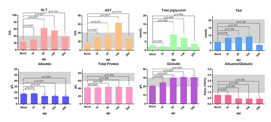 Figure 2: Biochemical detection of serum from ducks infected with DHVA-H. Serum biochemical markers, ALT, AST, triglyceride, total Bilrubin, total protein, albumin, globulin and ratio of albumin and globulin, were analysed by auto biochemical detector. The scope between two dash lines was the normal biochemical reference range in human. Data are presented as means ± SD (n = 3). *P < 0.05 indicates significant difference using student’s T-test.