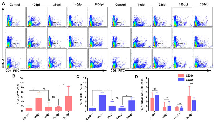 Figure 3: Flow cytometry analysis of CD4+ and CD8+ T-cells in liver (n = 3). The percentage of CD4+ and CD8+ T-cells were detected by FITC-conjugated goat anti mouse IgG. A. Flow cytometry analysis of CD4+ and CD8+ T-cells from 10 dpi to 280dpi. B. Significant difference analysis of positive CD4+ T cells in the course of infection. C. Significant difference analysis of positive CD8+ T cells in the course of infection. D. Significant difference analysis of between positive CD4+ and CD8+ T cells in the course of infection. Data are presented as means ± SD (n = 3). *P < 0.05 indicates significant difference using student’s T-test. ns, no significance.