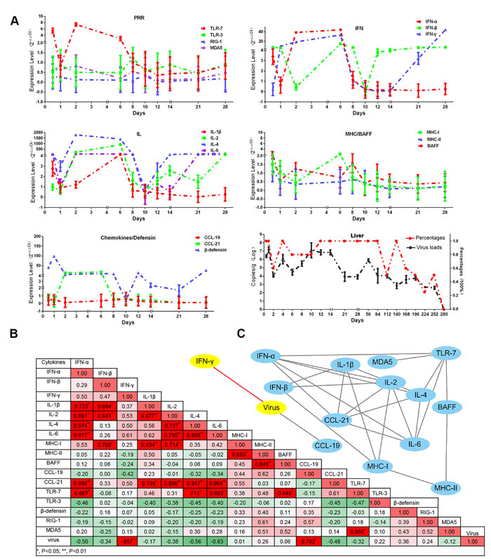 Figure 4: Dynamic immune-related gene expression profiles induced by DHAV-H strain and also the viral loads in liver. A. Immune-related genes are displayed in each part according to their biological functions, such as the activation of innate immune responses (TLR7, TLR3, RIG-1 and MDA5), effective interferons (IFN-α/β/γ) and interleukins (IL-1β/2/4/6), chemokines (CCL19/21), MHC-I and MHC-II, β-defensin, and B cell activating factor (BAFF). The relative values for each immune related genes were calculated by 2-ΔΔCt method by comparing with the non-infected group. The viral RNA copies (Log10/g) and their percentage in each group are displayed at the bottom right. Data are represented as mean +/- SD (n = 5). B. In order to understand the impact of virulence on immune networks, the correlations of each pair of immune related genes (P < 0.05 at least) were calculated using correlation analysis (Pearson). C. Those correlated pairs of immune related genes were visualized as immune network by Cytoscape software.