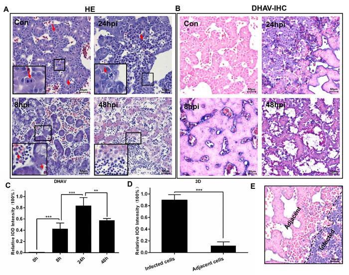 Figure 5: Microscopic lesions in the liver of duck embryos experimentally infected with DHAV-1 H strain. A. Representative liver HE staining from 8-hpi to 48-hpi of DHAV is displayed (n = 3). Typical histopathological changes are exemplified at the corner of each photograph. (Con) represents pre-inoculation liver photomicrograph. B. Representative liver DHAV staining by IHC. C. The relative intensity of positive DHAV staining was calculated by Image-Pro Plus software. 100% Integral Optical Density (IOD ) was defined as the most positive staining in the course of infection. The significant levels of their expression were analysed by Student’s T-test, two way. D. The positive 3Dpro staining intensity of infected cells was significantly higher than the adjacent cells. E. Representative 3D protein staining at 24-hpi. The infected cells and adjacent cells were labelled. NS, No significance; *, P < 0.05; **, P < 0.01; ***, P < 0.001. The brightness and contrast are slightly modified to create a uniform background.
