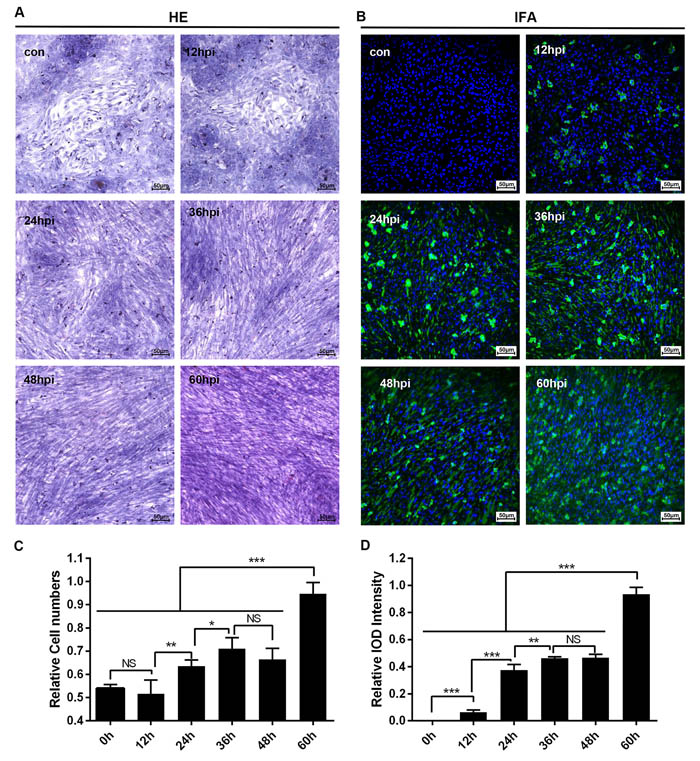 Figure 6: Microscopic lesions and virus replication of duck embryo HSCs infected with DHAV-1 H strain. A. Representative duck embryo HSC HE staining (n = 2). B. Virus detection through indirect immunofluorescence after DHAV infection from 12-hpi to 60-hpi are displayed on the left and right (n = 2). C. The relative cell numbers were calculated by Image-Pro Plus software. D.The intensity of positive staining were also calculated by Image-Pro Plus software. The significant levels of their expression or numbers were analysed by Student’s T-test. NS, No significance; *, P < 0.05; **, P < 0.01; ***, P < 0.001. The relative cell numbers was calculated by comparing the slides with maximum cells (1.0). The 100% Integral Optical Density (IOD) intensity was defined as the slides with the most positive staining. The brightness and contrast are slightly modified to create a uniform background.