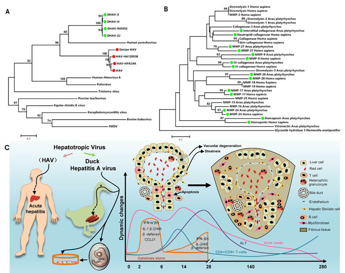 Figure 7: Comparatively phylogenetic relationship with “Hepatitis A virus” and fibrosis-related genes in humans and ducks and the process of liver injury and repair during DHAV infection. A. The phylogenetic tree of the DHAV-related genes was constructed from the complete genomic sequences of the picornaviruses using the neighbour-joining method. B. The complete amino acid sequences of the fibrosis-related genes in the genomes of humans and ducks were used to construct a phylogenetic tree using the neighbour-joining method. The percentage of replicate trees in which the associated taxa clustered together in the bootstrap test (1000 replicates) are shown above the branches. C. The duck has a similar liver disease caused by avian hepatropic virus (DHAV). This virus can also be cultured in duck embryos or its primary cells. During the period of infection, virus rapidly replicates to a high level, and then the transient cytokine storm reduces the virus to a comparatively lower level and gradually disappears until 280dpi. Hepatocellular injury was characterized as vacuolar degeneration, steatosis and apoptosis at early stage of infection. While those injured cells were replaced by collagenous fiber at later stage of infection. Those fibres may be secreted by myofibroblast when hepatic stellate cells were activated by injured liver cells. Meanwhile, strong recruitment of plasmocytes and heterophilic granulocytes were identified by HE assays. However, the comparatively lower CD4+ and CD8+ T-cells recruited to liver might lead to a persistent infection. Those immune cells may combine with interferons and interleukins to eradicate viral replication from liver.