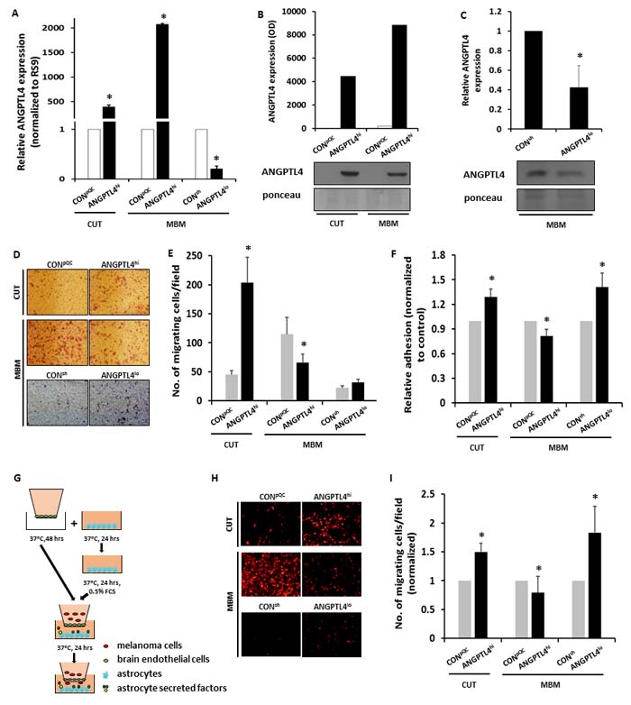 Figure 2: ANGPTL4 controls the malignancy phenotype of cutaneous and brain metastasizing melanoma variants. A.-C. Cutaneous (CUT) and melanoma brain metastasizing (MBM) variants were transduced with an ANGPTL4 cDNA-containing construct (ANGPTL4hi) or with the backbone construct pQCXIP (CONpQC). MBM cells were transduced with a mixture of 4 different shANGPTL4-containing constructs (ANGPTL4lo), or with the control construct (CONsh). The efficacy of ANGPTL4 over-expression or down-regulation was verified: (A) RT-qPCR analysis was performed to determine the mRNA expression level of ANGPTL4. The bars represent the relative ANGPTL4 expression (normalized to RS9) in ANGPTL4hi or ANGPTL4lo cells compared to control cells + SEM obtained in one measurement in at least three independent experiments. *P < 0.05. (B, C) Supernatants of the transduced cells were subjected to Western blot analysis. ANGPTL4 was detected by specific Abs. The bars represent the relative ANGPTL4 expression in ANGPTL4hi or ANGPTL4lo cells compared to control cells + SEM obtained in one measurement in two-three independent experiments. *P < 0.05. Representative blots are shown. Ponceau staining was used for loading control. D., E. Melanoma cells were allowed to migrate through collagen coated transwells for 24 hrs. The migrated cells were fixed and counted. (D) Representative images are presented (X10 magnification). (E) The bars represent the average number of migrating cells per field in three independent experiments performed in triplicates + SEM. *P < 0.05. F. BEC were cultured for 24 hrs to form a confluent monolayer and stimulated with 100 units/ml TNFα and IFNγ for additional 24 hrs. mCherry- or GFP-expressing melanoma cells were added and allowed to adhere for 30 min at 37°C. The fluorescence signal of labeled cells was measured before and after removal of non-adherent cells. The bars represent the average % adherent cells (normalized to control cells) + SEM in at least three independent experiments. Six replicates were performed in each experiment. *P < 0.05. G.-I. BEC were cultured for 48 hrs on the upper side of the apical chamber of transwell inserts to form a confluent monolayer. Astrocytes were cultured in 24-well plates for 24 hrs and starved for additional 24 hrs to allow the secretion of soluble factors. mCherry-expressing melanoma cells were added onto the BEC monolayer and allowed to migrate for 24 hrs towards the astrocytes (G). The migrated cells were fixed and counted. (H) Representative images are presented (X10 magnification). (I) The bars represent the average number of migrating cells per field (normalized to control cells) in at least three independent experiments performed in triplicates + SEM. *P < 0.05.