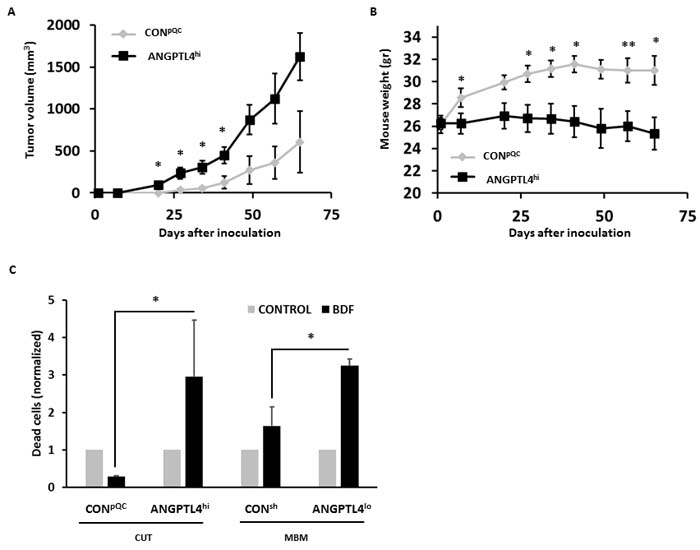 Figure 4: ANGPTL4 alters the tumorigenic potential of melanoma cells. A. Volume of cutaneous tumors following subdermal implantation of CONpQC vs. ANGPTL4hi cutaneous cells. Tumor dimensions were measured using a caliper and volume was obtained as described in Materials and Methods. The average tumor volume + SEM is presented. *P < 0.05. B. Mice were weighed weekly following melanoma inoculation. The averege mouse weight + SD is presented. *P < 0.05. C. Melanoma cells were treated for 72 hrs with mouse BDF. Then, cells were trypsinized and cell death was determined by measuring DAPI incorporation. The bars represent the relative cell death of BDF treated cells compared to their controls + SEM obtained in one measurement in three independent experiments. *P < 0.05.