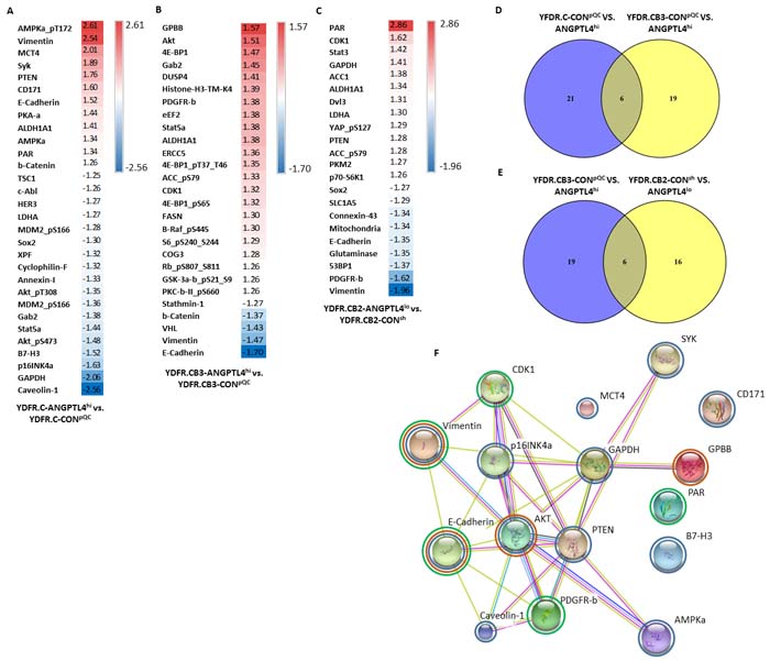 Figure 5: Proteomic expression analysis of ANGPTL4 high and low expressing cells. The expression of 305 proteins was examined using RPPA analysis in the ANGPTL4hi and ANGPTL4lo cells vs. their corresponding control cells. A., B., C. Comparisons were done for each pair of cells: (A) cutaneous ANGPTL4hi vs. CONpQC cells, (B) brain metastasizing ANGPTL4hi vs. CONpQC cells and (C) brain metastasizing ANGPTL4lo vs. CONsh cells. The tables show the normalized expression of differentially expressed proteins with FC < -1.25 or FC>1.25. D., E. Venn diagrams were used to compare lists of differentially expressed proteins. (D) Proteins differentially expressed in both comparisons obtained in (A) and (B). (E) Proteins differentially expressed in both comparisons obtained in (B) and (C). F. Protein-protein interactions of differentially expressed proteins with FC < -1.5 or FC>1.5 from all three comparisons. Circled in blue are proteins from comparison (A), circled in orange are proteins from comparison (B), and circled in green are proteins from comparison (C).