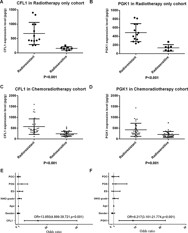 Radiotherapy cohort was patients who have accepted postoperative radiotherapy (n = 85). The multivariate Logistic regression was performed with enter method to analyze the OR of the CFL1 and PGK1 expressions and clinicopathology parameters which were involved in gender, age, WHO grade, extent of surgery, preoperative situation and postoperative chemotherapy. The outcome revealed only protein expressions were the influential variables to radiosensibility. CFL1 expression Odds Ratio = 13.950 (95% CI = 4.899–39.721, p < 0.001), PGK1 expression OR = 8.217 (95% CI = 3.101–21.774, p < 0.001). (Figure 1E, 1F).