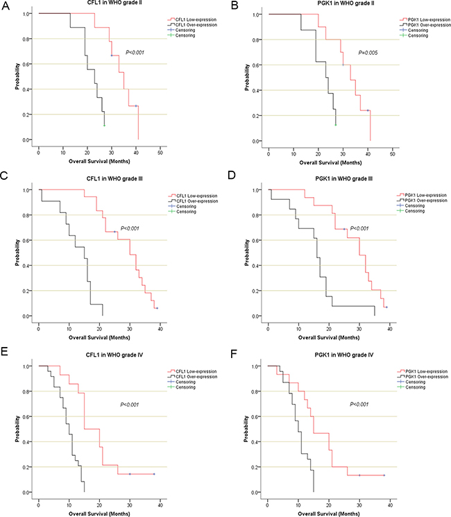 Figure 2: The Kaplan-Meier survival analysis described the survival curve of irradiated patients CFL1 and PGK1 expressions in each WHO grade. (A) CFL1 in WHO II; (B) PGK1 in WHO II; (C) CFL1 in WHO III; (D) PGK1 in WHO III; (E) CFL1 in WHO IV; (F) PGK1 in WHO IV.